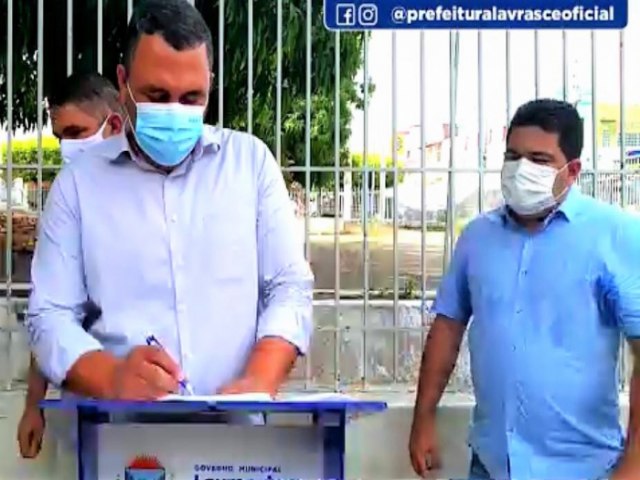 Assinaram a ordem de serviços, o Prefeito de Lavras/CE - Ronaldo da Madeireira, o Vice-Prefeito Dr. Tavinho, o Secretário de Agricultura e Meio Ambiente Fábio Peixoto, Secretário de Obras Machado Furtado e Cicero Anderson Generoso Bezerra representante da construtora.